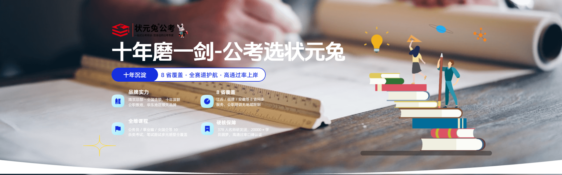 状元兔公考经过“十年磨一剑”的砥砺奋进,发展成为国内民办教育公务员培训事业的独导品牌,立足大学生校园,仰望星空,脚踏实地,培养出一批批家之娇子,国之栋梁,瞄准国家发展战略需求,为中国新时代教育发展,写下了浓墨重彩新篇章。